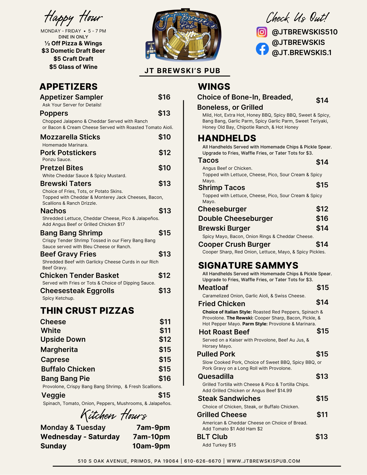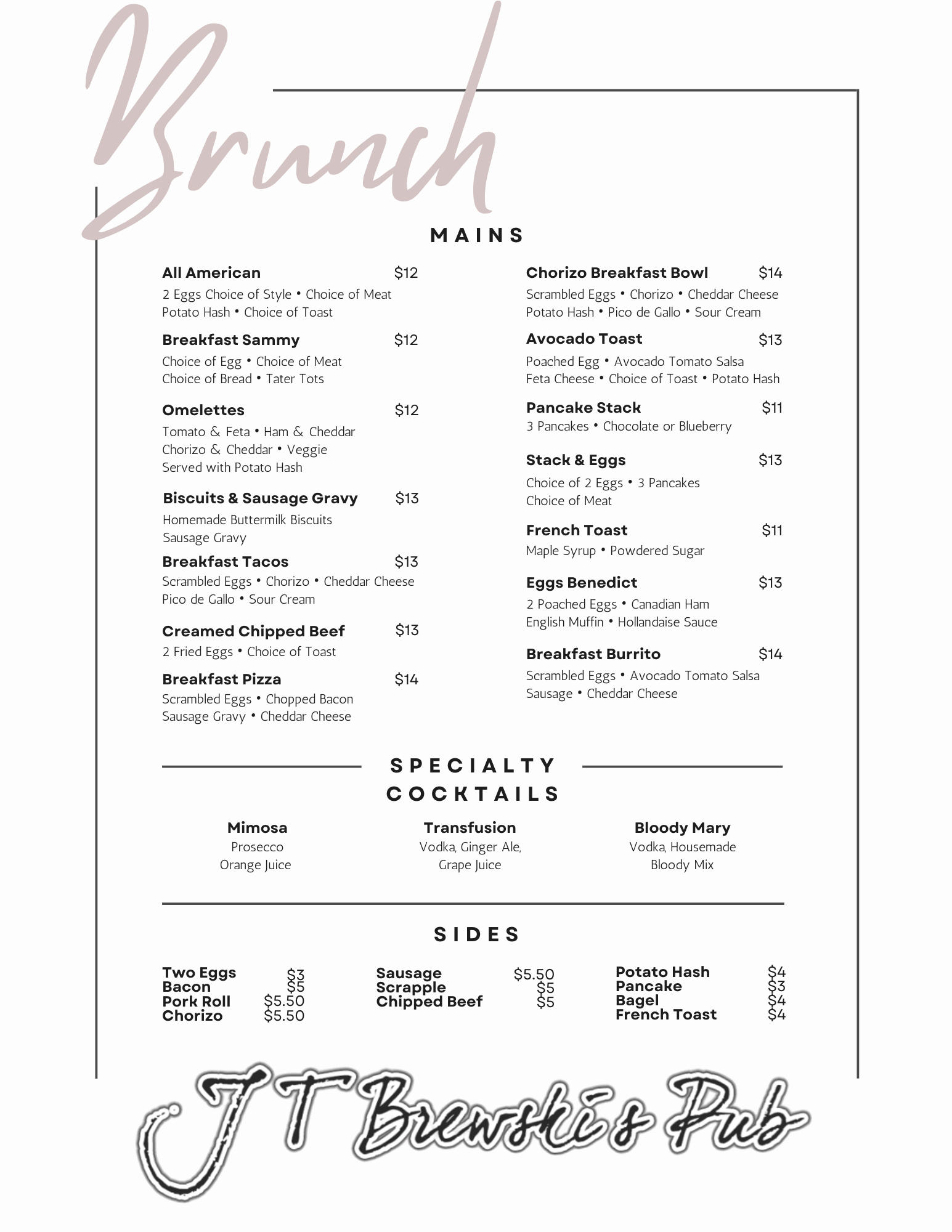 Our weekly newsletter is complimentary, emailed every Friday morning and includes what’s new and what’s happening at J.T.Brewskis.